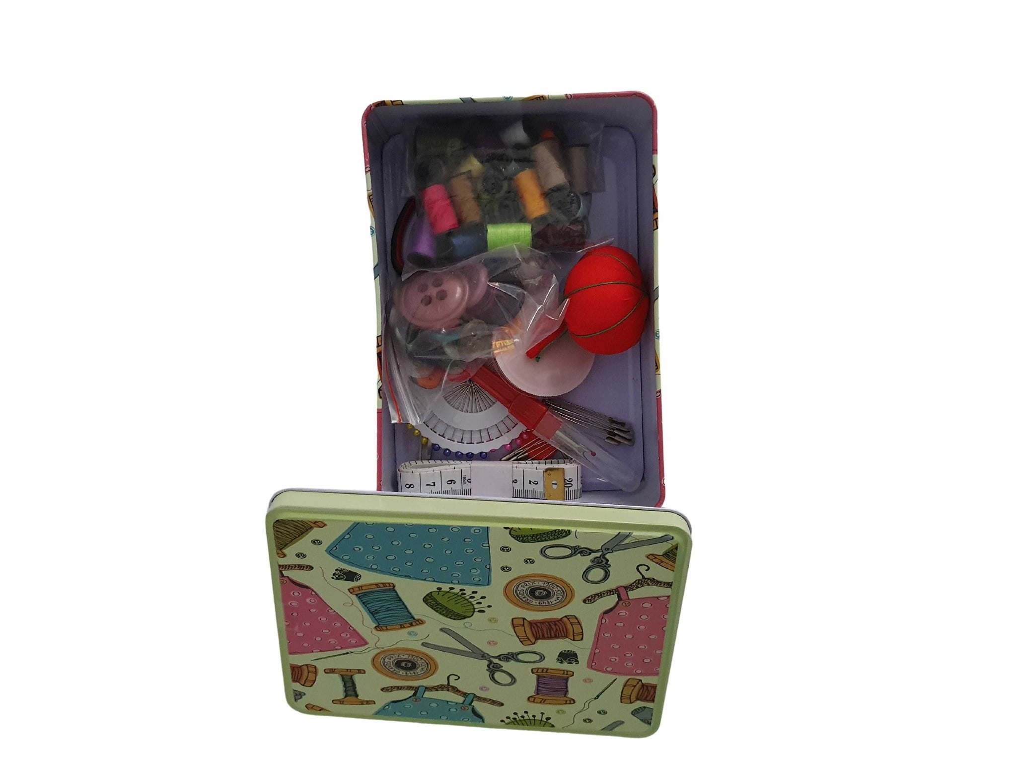Set cucito Stafil portatile con contenitore in latta (fantasia cucito) con tutto l'occorrente per ogni piccola evenienza soprattutto in viaggio con te non può mancare.