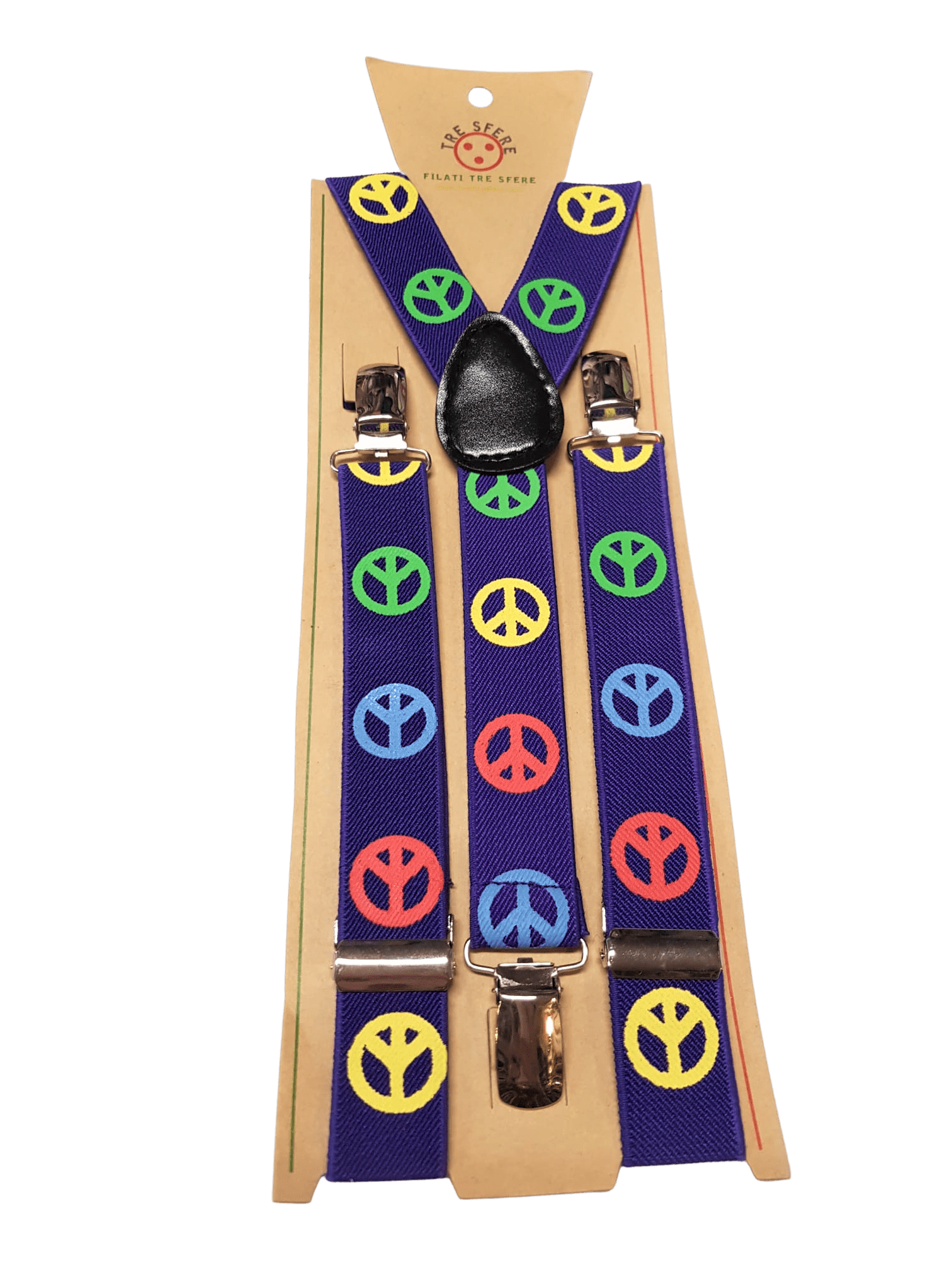 Bretelle per bimbo con fantasia simboli della pace colorati su sfondo viola.